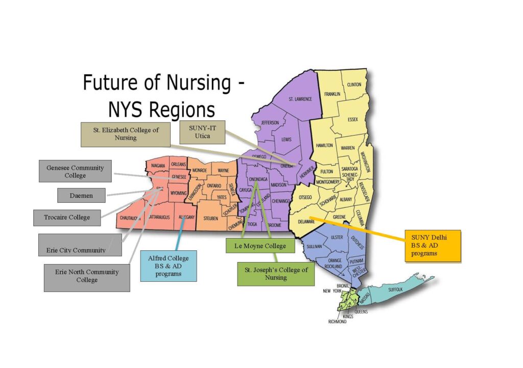The Foundation of NYS Nurses will target funds from a two-year $300,000 grant from the Robert Wood Johnson Foundation to support the NYS Future of Nursing Action Coalition’s efforts to help current and future registered nurses (RNs) to advance their academic nursing preparation. The funds will promote the replication of a successful collaboration between the associate degree program at St. Joseph’s College of Nursing and the upper-division bachelor of science (BS) degree program in the Department of Nursing at Le Moyne College, both in Syracuse, NY. This model is designed with a 1+2+1 sequence by which an Associate Degree and licensure can be obtained at the conclusion of the third year of study and requires only one additional year to obtain the BS degree. Since its inception six years ago, other nursing programs across the state have begun or are interested in replicating the model. This grant will increase the number of RNs pursuing the BS in currently established partnerships and expand the number of partnerships. “This project will enable the originators of this model to establish an educational collaborative with public and private sector colleges and their practice partners to further implement this model in other rural and urban areas of the state. With an over 70 percent completion rate, higher than any RN to BS model being utilized in the country, increasing the number of involved partners will significantly contribute to New York’s effort to achieve the Institute of Medicine’s goal of having 80 percent of RNs prepared with a bachelor’s degree by 2020,” stated Cathryne A. Welch and Robert F. O’Connell, NYS Action Coalition co-leads.
